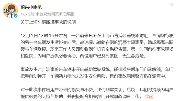 12月1日,蔚来汽车官方辟谣微博号“蔚来小喇叭”发布《关于上海车辆碰撞事故的说明》。